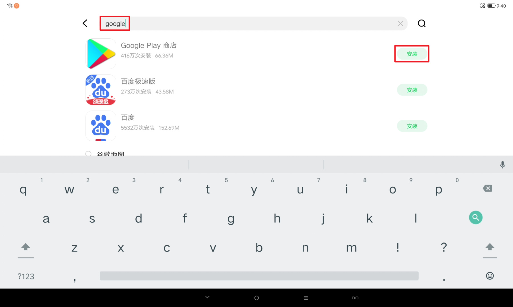 검색창에 google 입력 후 'Google Play 商店' 설치(安装).
