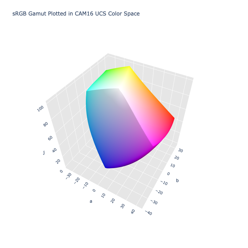 RGB 색상을 XYZ 색공간을 거쳐서 CAM16-UCS (Jab → JCh)로 변환합니다.