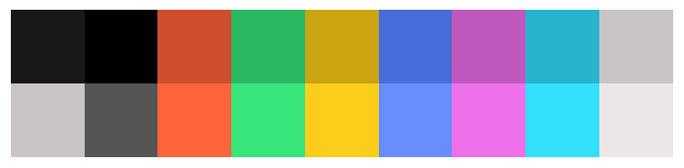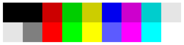 흑, 적, 녹, 황, 청, 자, 옥, 백의 '기본' 8색 + '밝은' 8색.